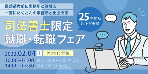 【終了しました】【司法書士限定】就職・転職フェアオンライン|2023年2月開催 - リーガルジョブマガジン司法書士限定 就職・転職フェアオンライン2023の申し込みページ。